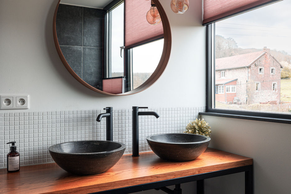 Das Badezimmer mit separatem WC ist hell und modern. Es ist mit einem Doppelwaschbecken und einer ebenerdigen Dusche ausgestattet.